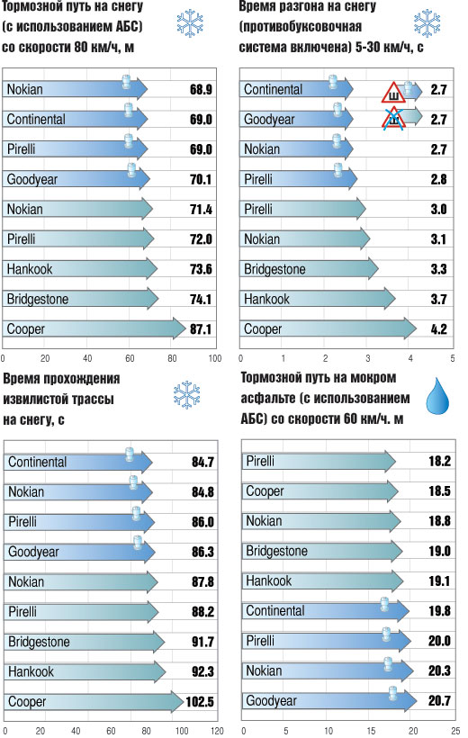 Откатав стандартную программу испытаний, эксперты перевели все результаты в баллы (по десятибалльной шкале: чем лучше результат, тем выше балл) и сложили их с учетом весомости тех или иных потребительских качеств. Приоритеты здесь такие: сцепные свойства и управляемость на льду (45%), на снегу (25%), на асфальте (15%), сопротивление слашплэнингу (10%), акустический комфорт (5%).