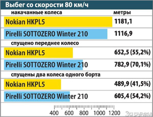 Начинаем с выбегов – они характеризуют сопротивление качению. С одним спущенным колесом «Нокиан» выбег уменьшается почти в два раза – 55,2% от нормы, а с «проколотым» бортом – всего 41,5%. «Пирелли» менее привередливы: с одним «проколом» – 70,1%, с двумя – 54,2% (почти как у «Нокиан» с одним пустым колесом).