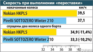 «Пирелли» в «трехколесном» варианте тормозит на 1,2 м дольше (это 12,5%), а с пустым бортом добавляет еще 0,4 м, увеличивая тормозной путь на 14,8%.
